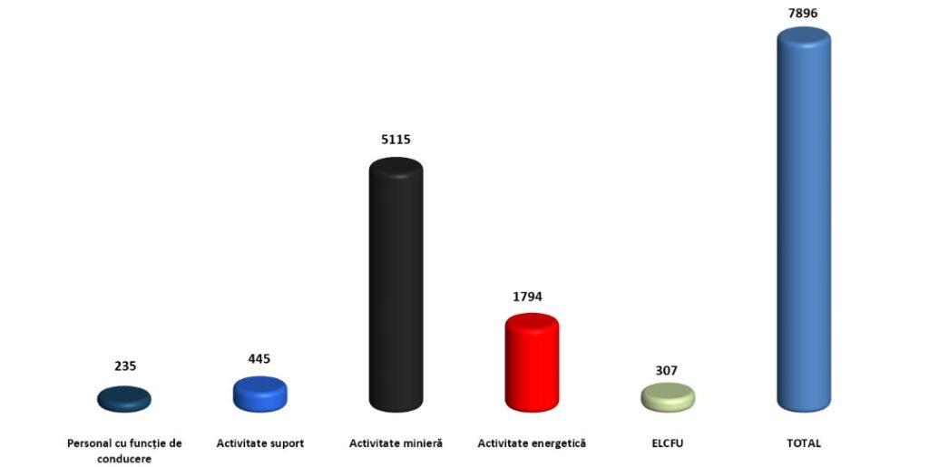 Conform graficului postat de Complexul Energetic Oltenia, compania a început anul cu 7.896 de salariați. Dintre aceștia, 235 aveau funcții de conducere, 445 reprezentau activitate suport, 5.115 lucrau în zona minieră, 1.794 în activitatea energetică și 307 la căi ferate uzinale.