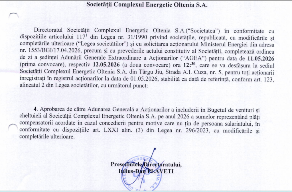 „Aprobarea de către Adunarea Generală a Acționarilor a includerii în Bugetul de venituri şi cheltuieli al Societății Complexul Energetic Oltenia S.A. pe anul 2026 a sumelor reprezentând plăți compensatorii acordate în cazul concedierii pentru motive care nu țin de persoana salariatului, în conformitate cu dispozițiile art. LXXI alin. (3) din Legea nr. 296/2023, cu modificările şi completările ulterioare” – este punctul care va fi discutat pe 11 mai.