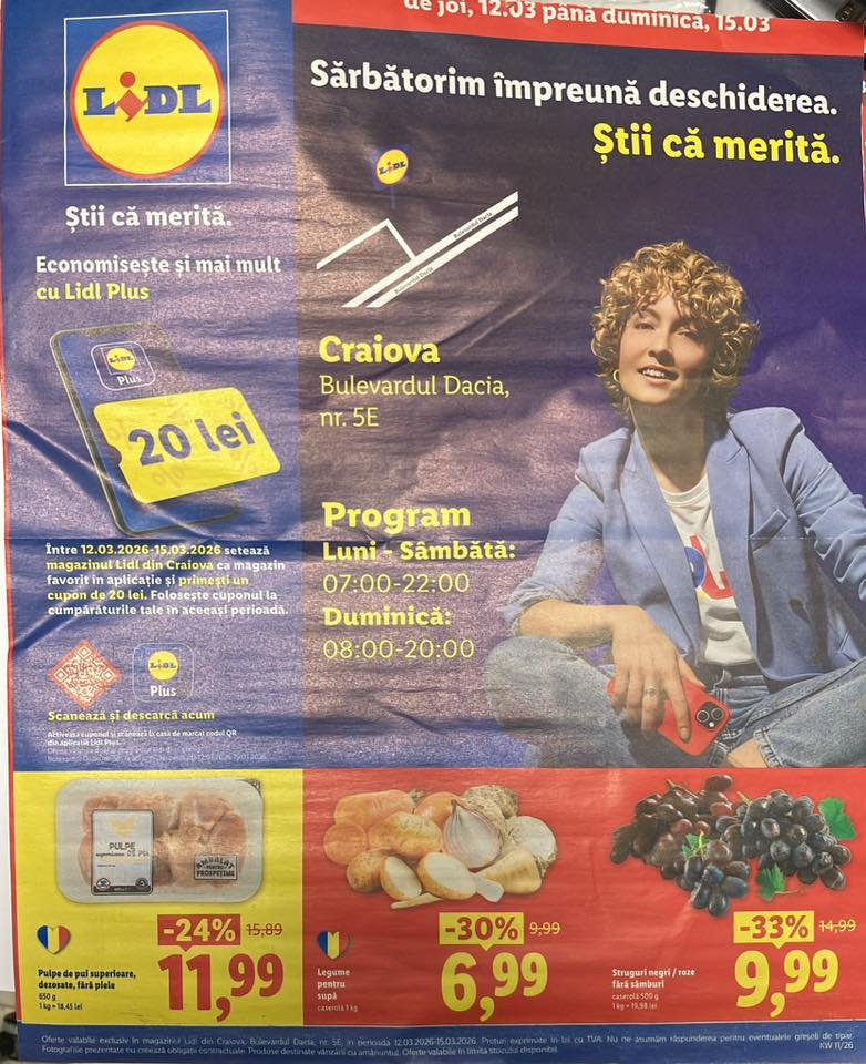 În plus, clienții care folosesc aplicația Lidl Plus pot primi un cupon cadou în valoare de 20 de lei. Pentru a beneficia de această ofertă, cumpărătorii trebuie să descarce aplicația Lidl Plus, să seteze magazinul din Craiova de pe Bulevardul Dacia și să scaneze aplicația la casa de marcat. Cuponul poate fi folosit ulterior la cumpărături.